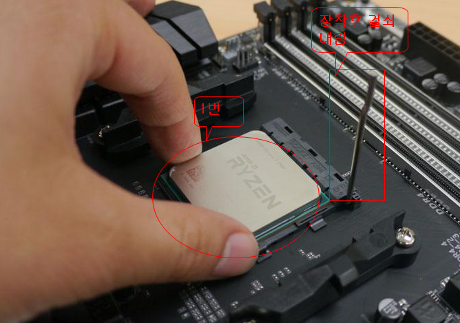 위와같이 CPU를 조심히 잘 들어 소켓부분에 맞게 안착시켜 걸쇠를 내려주면 끝이난다.