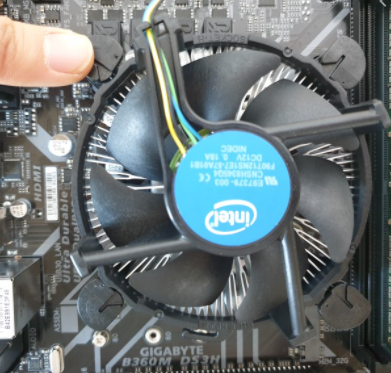 위의 이미지 처럼 소켓에 맞춰 걸쳐주면되고 우측의 걸쇠는 내려주도록 한다, 그럼 CPU는 장착이 끝났고 CPU쿨러를 장착하게 되는데 보통 일반적인 경우 CPU를 구입하면서 번들로 들어있는 제품을 많이 사용하게 된다