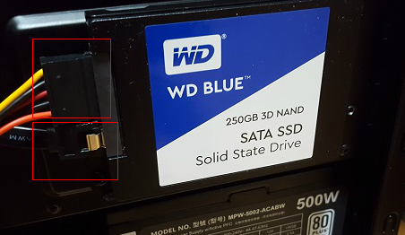 위의 제품은 SSD로 상단의 네모부분은 파워서플라이의 전압 공급, 아래케이블은 SATA 케이블로 메인보드의 SATA포트와 연결하면 된다. 또한 케이스별로 저장장치를 안착시키는 위치가 다르므로 맞는 슬롯을 잘 찾아 고정시켜주도록 하자.