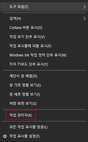 작업 관리자 버튼을 눌러 현재 작동중이 프로세서들을 확인하도록 하자.