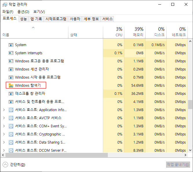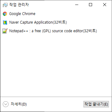 위의 화면에서는 간단한 내용만 확인할 수 있으므로, 좌측하단의 "자세히" 버튼을 눌러 작업관리자를 상세히 확인하도록 한다.