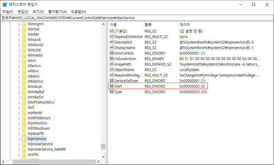 레지스트리 편집기를 실행하였다면 WpnService 의 start 값을 변경함으로써 처리할 수 있다.
