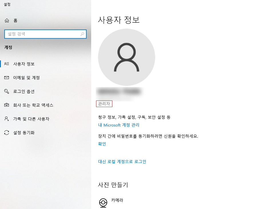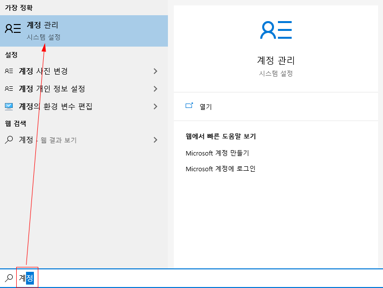 현재 자신의 로그인되어있는 계정이 관리자 권한인지, 또는 일반 사용자 권한인지를 우선적으로 확인하기 위하여 윈도우 키를 눌러 "계정 관리" 를 검색 후, 계정 관리 화면으로 이동하도록 한다.