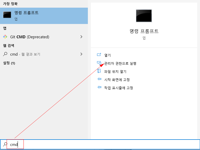 아래의 명령어는 관리자권한으로 CMD를 실행시켜야만 동작하므로 반드시 관리자 권한으로 도스명령어창을 띄워주도록 하자.