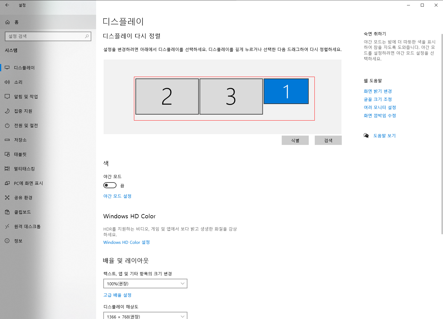 필자의 경우 위의 이미지와 같이, 모니터를 3개를 사용하고있다, 주 모니터를 선택하는 기능은 두개이상의 모니터를 사용시에만 설정이 가능하며, 메인으로 사용할 모니터를 선택하여 준다.