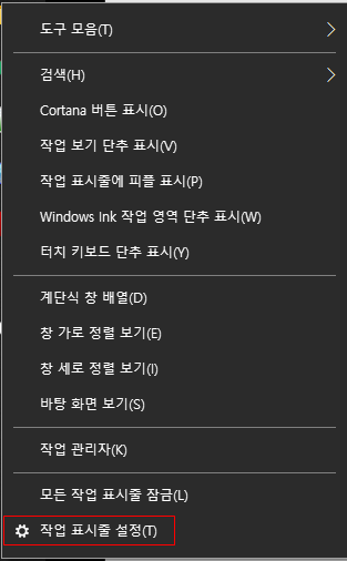 작업표시줄에서 우클릭을 눌러, "작업 표시줄 설정" 항목을 누른다.