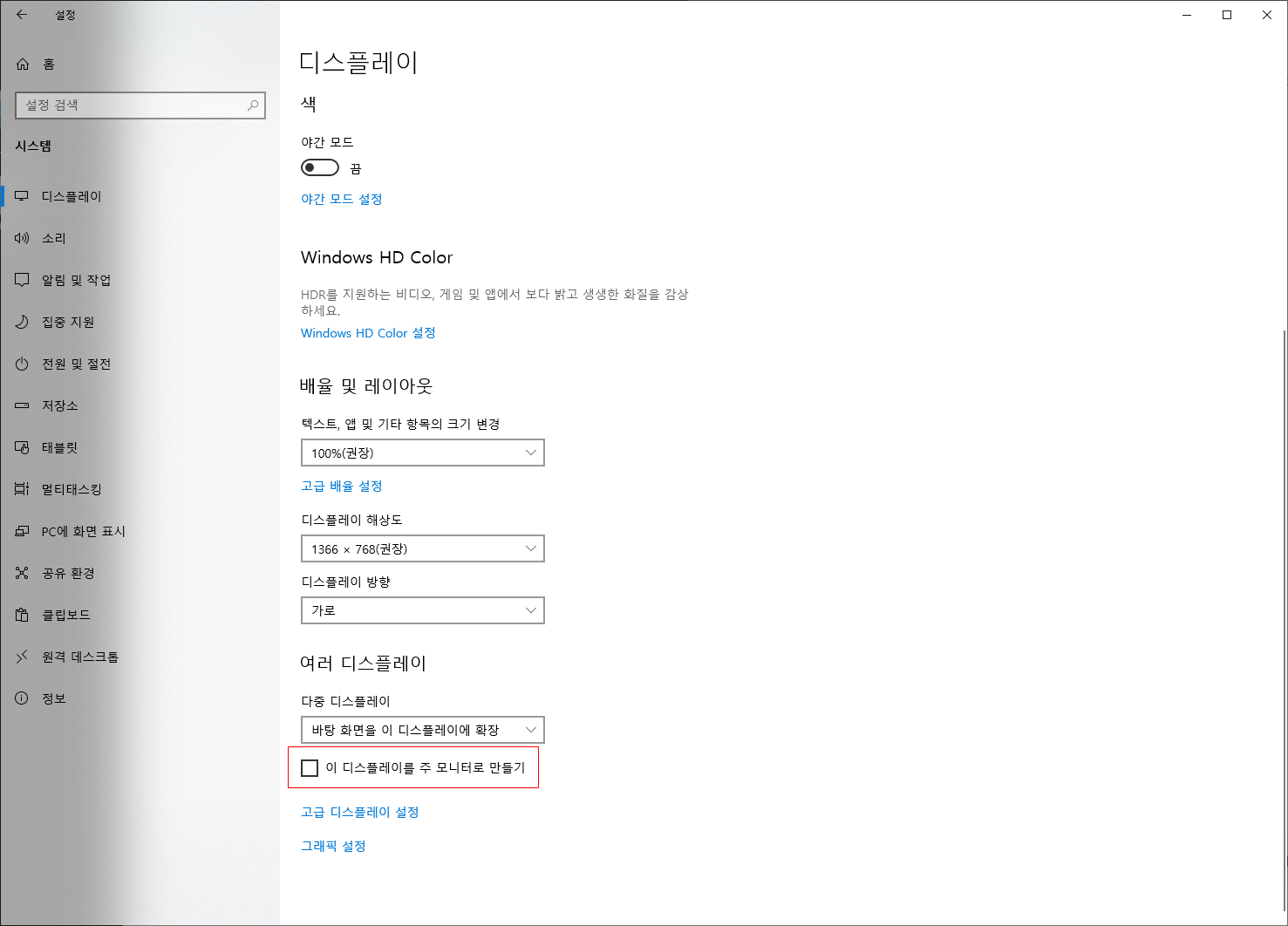 위의 디스플레이 설정 버튼을 누른 뒤, 디스플레이 관리 창에서 메인이 될 화면을 선택한다.