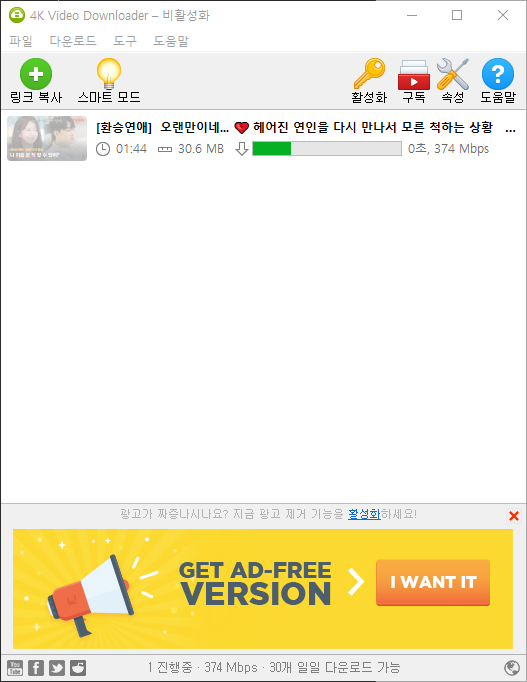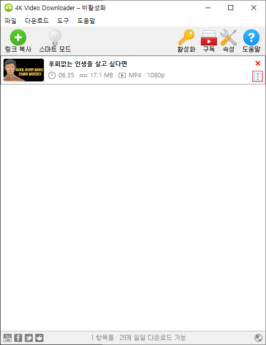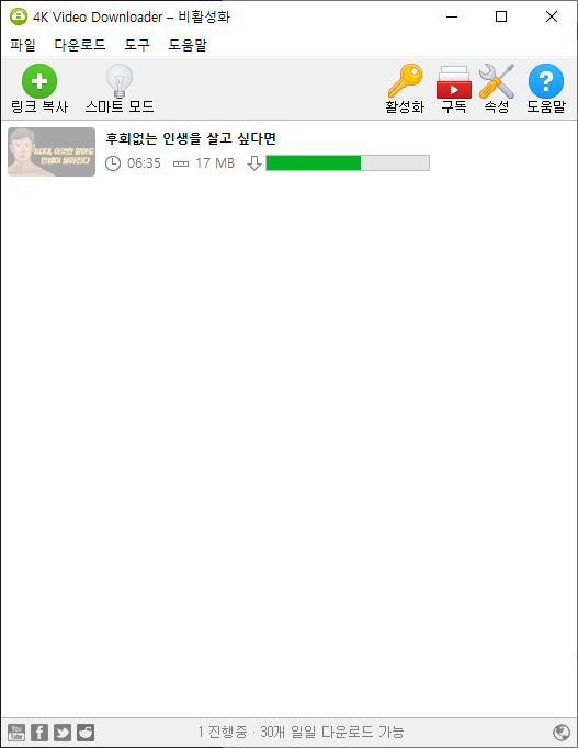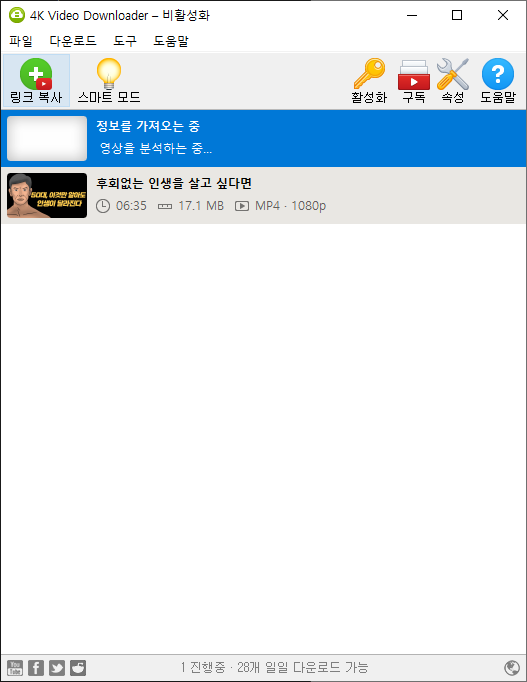 해당 프로그램에서는 편리한 기능으로 스마트 모트가 있는데, 이 스마트 모드를 선택하게되면 영상의 링크를 복사후, 프로그램으로 이동하게되면 자동으로 다운받는 기능입니다