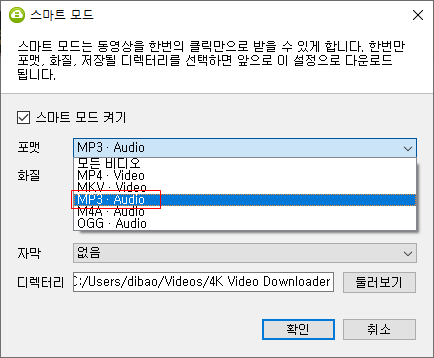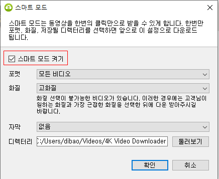 스마트 모드 항목을 선택해 주고, 포맷은 어떤포맷으로 할것인지와, 화질, 디렉토리 를 지정해주면 매번 다운로드시에 선택할 필요없이 클릭한번으로 다운받을 수 있는 기능을 제공합니다