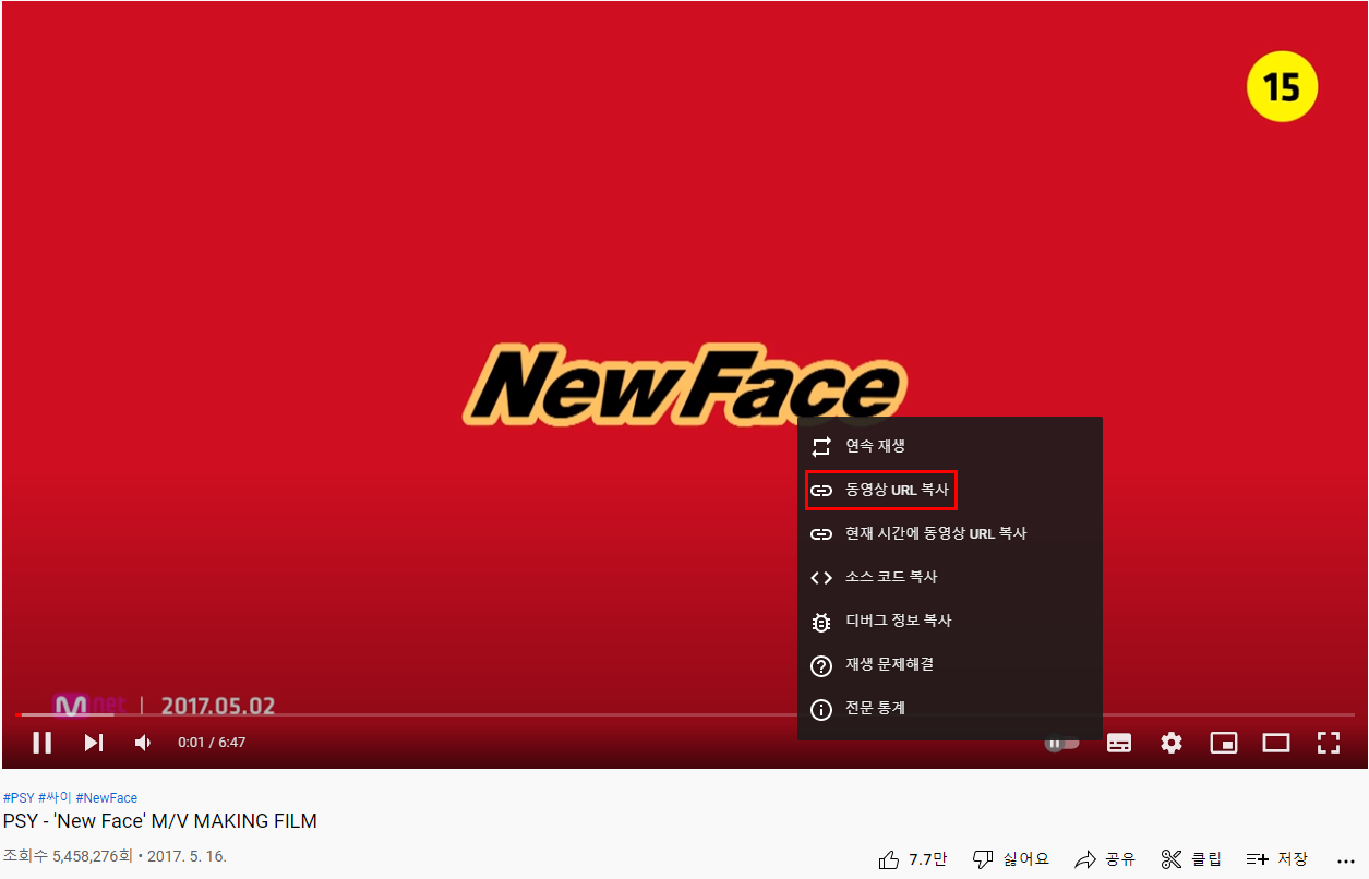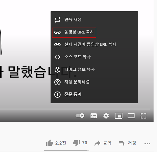 링크를 복사하는 방법에는 두가지가 있는데 영상에 우클릭버튼을 눌러 동영상 URL 복사 항목을 선택하여 복사하는 방법과