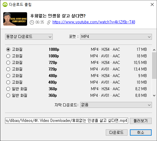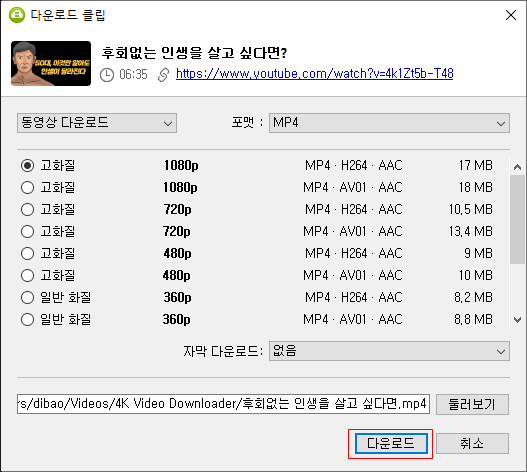 저장공간이 넉넉한 경우라면 가급적 고화질의 선택을 하는편이 나중 재생시 유리하겠으며 "다운로드" 버튼을 눌러 다운로드를 실행하도록 합니다