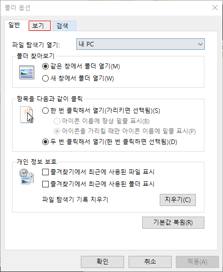폴더를 관리하는 옵션창이 확인되는데 두번째 탭인 "보기" 탭으로 이동한다.