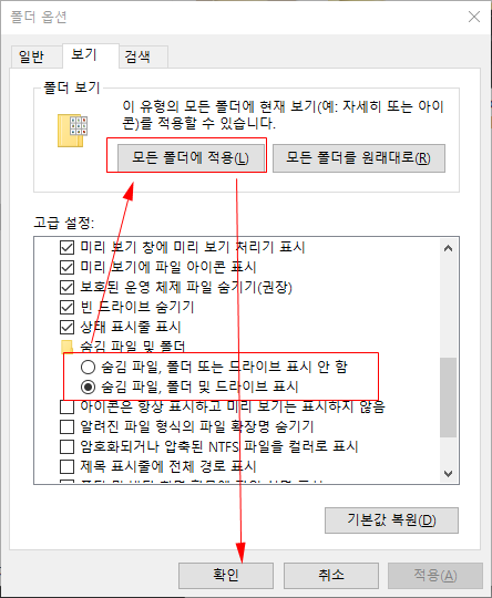 위의 설정에 따라 해당 드라이브의 숨김 파일을 표시 하거나 숨기거나로 설정이 가능하며, 해당 설정이 모든 폴더에 적용을 희망하는경우, 상단의 모든 폴더에 적용 버튼을 누른 뒤, 확인버튼을 누른다.