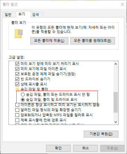 파일 및 폴더 설정 부분에 스크롤을 내리다보면 숨김 파일, 폴더 및 드라이브 표시 항목을 선택한다.