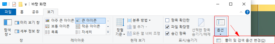 숨김설정을 하고자 하는 폴더를 열어준 뒤, 우측의 옵션 버튼을 눌러 "폴더 및 검색 옵션 변경" 항목을 선택한다.