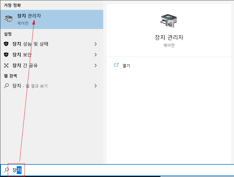 윈도우 키를 눌러 "장치 관리자" 입력 후 실행
