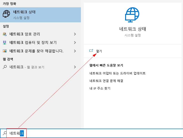 윈도우키를 눌러 "네트워크 및 인터넷" 를 입력하여 네트워크 관리 창을 띄우도록 한다.