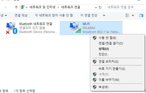 제어판 -> 네트워크 및 공유 센터 -> 어댑터 설정 변경 으로 이동하면 위의 화면과 같이 무선 네트워크 또는 WI-FI 항목의 연결이 사용 상태인지 체크하도록 한다, 무선 네트워크 를 우클릭 하여 사용 안 함(B) 상태인 경우에는 "사용함" 을 선택하면 되겠다.