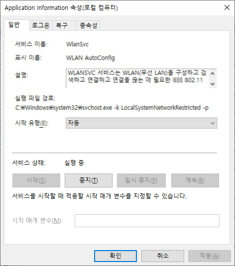 시작 유형은 "자동" 으로 변경하고, 위의 서비스 상태 에서 실행되어있지 않은 상태라면 "시작" 버튼을 눌러 실행하도록 한다.