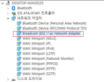 네트워크 어댑터 항 목의 드라이버가 정상적으로 설치되었는지 확인