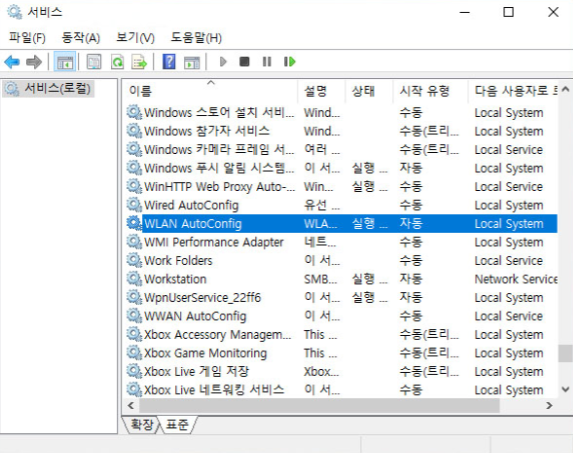 무선 랜 드라이버가 설치되면서 사용자 눈에는 보이지않지만 백그라운드에 서비스가 구동되게 되는데 이 서비스가 정상적으로 실행중이 아니라면 사용이 불가능하다.