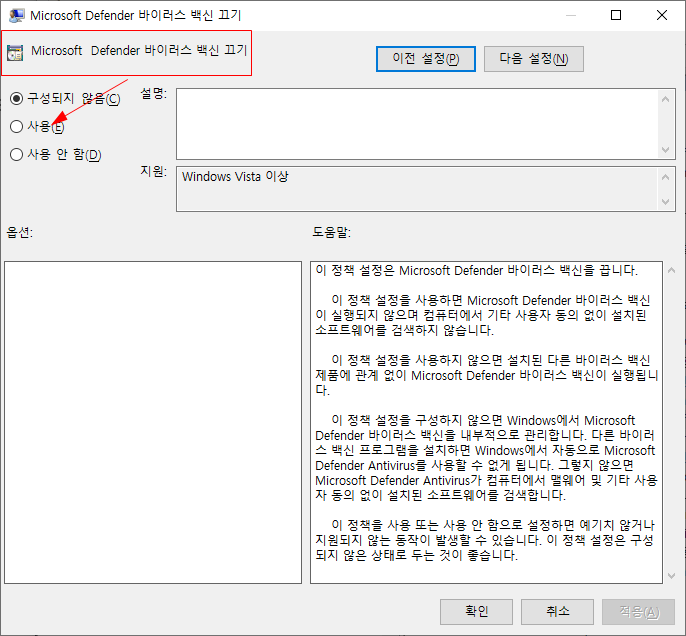 바이러스 백신 끄기의 "사용"을 진행하게 되는경우 사용하지 않음으로 정상적으로 설정 되며 재부팅해준다면 설정은 끝이난다.