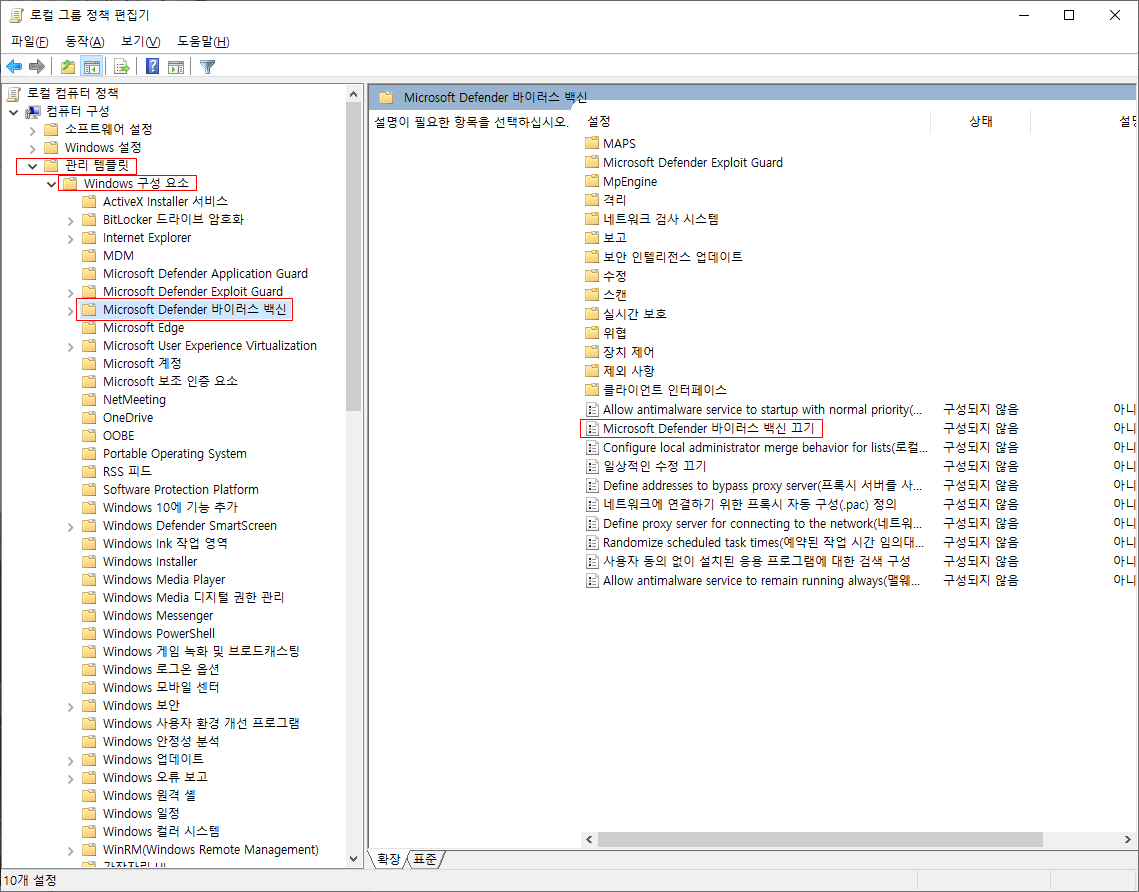 Microsoft Defender 바이러스 백신 끄기 항목을 더블클릭한다.