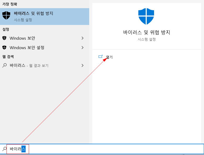 윈도우 키를 누른 후, "바이러스 및 위협 방지" 입력