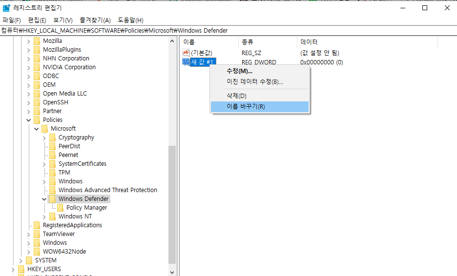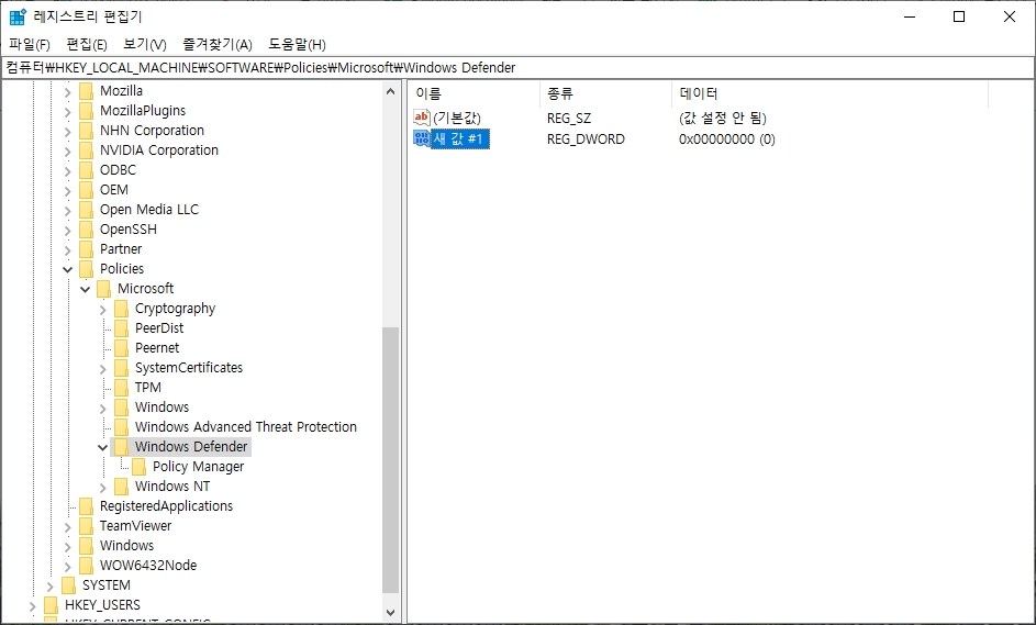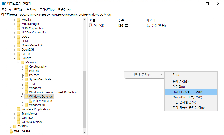 컴퓨터\HKEY_LOCAL_MACHINE\SOFTWARE\Policies\Microsoft\Windows Defender