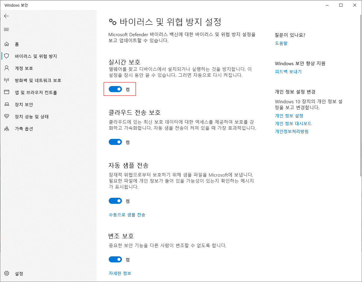 실시간 보호 영역에 "켬" 으로 되어있다면 클릭하여 "끔" 으로 변경하면 실시간 보호를 해제할 수 있다.
