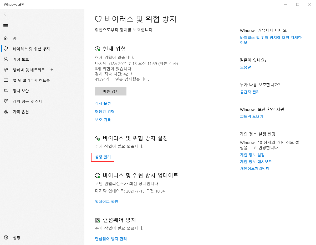 바이러스 및 위협방지 관리 창에서, "바이러스 및 위협 방지 설정" 이동