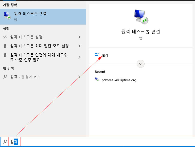 윈도우 버튼을 눌러 "원격 데스크톱 연결" 을 입력하면 아래와 같이 확인된다.