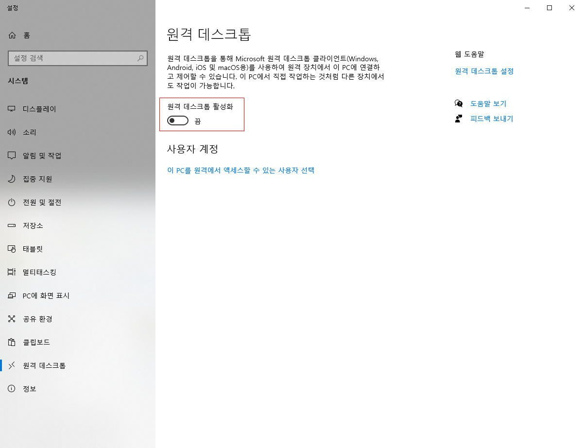 원격제어할 데스크톱에서는 별도의 설치 없이 윈도우를 설치함과 동시에 해당툴이 이미 설치되어있다.