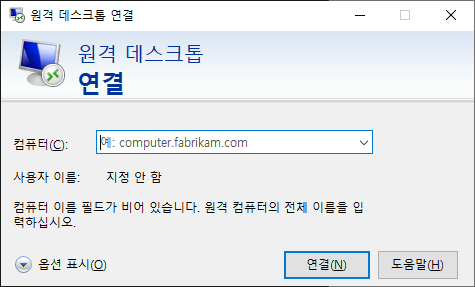 입력 한다면, 위와같이 계정을 입력하는 화면이 나오게 되는데 해당 계정은 원격지의 데스크톱 로그인시 사용되는 계정이며 "다른 옵션 선택" 항목을 선택하여 "다른 계정 사용" 항목을 선택 후 계정을 입력하면 되겠다.