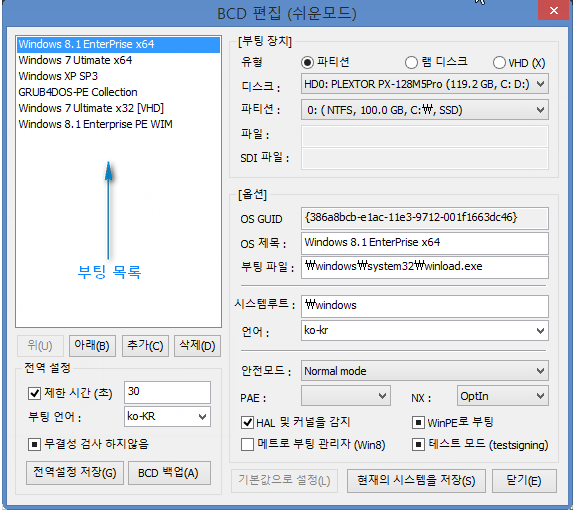 해당 데이터들은 cmd 도스명령어 창에서 명령어를 통해 값을 편집할 수 있지만 윈도우기반의 운영체제를 사용하던 유저들의 경우 명령어의 사용이 쉽지가 않다, 따라서 "BOOTICE" 툴을 이용하여 부팅 설정데이터를 설정할 수 있다