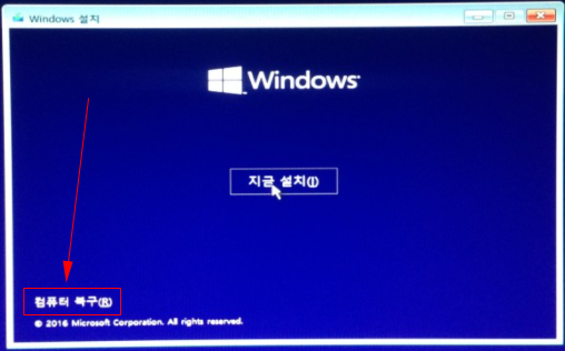 위의 글을참고하여 복구/포맷 화면으로 이동하였다면 설치창 좌측 하단에 "컴퓨터 복구" 버튼을 눌러 이동한다.