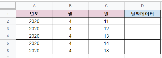 년도,월,일 데이터가 분할되어있는경우 날짜서식에 맞춰 데이터를 합쳐보도록 하겠습니다.