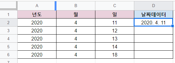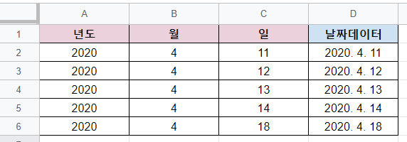 위와같이 날짜형식의 데이터가 맞다면 날짜데이터가 완성되지만,