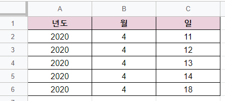 데이터는 위와같이 A열에는 년도, B열에는 월, C열에는 일자 데이터가 있습니다.