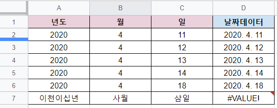 날짜형태로 대입할수 없는경운에는 #VALUE, 값이 올바르지않다는 에러문구가 반환됩니다