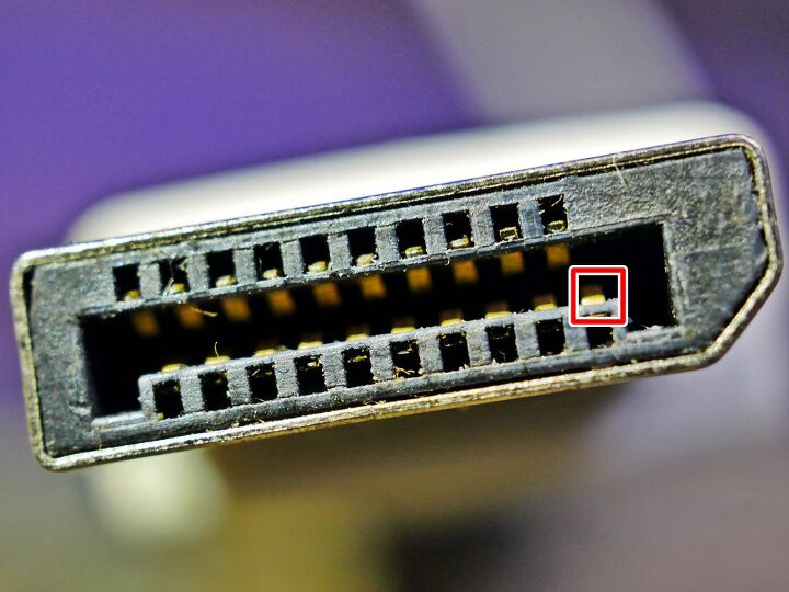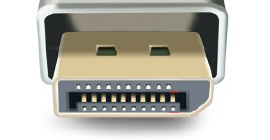 DP 케이블의 빨간색 네모영역이 20번 핀의 영역이다, 해당 핀이 있는경우 대략 3V 만큼의 전력을 더 공급하게 되는데 해당 전력은 있어도 없어도 모니터 출력시 전혀 문제되지않는 정도이다, 반대로 해당 전압을 더 공급함으로써 그래픽카드와 모니터에 부하가 발생되게 되는데, 이 부하는 누적됨에 따라 단자가 손상될 가능성이 있다, 따라서 일반적으로 사용되는 가정집의 경우 DP 케이블을 구매시 20번 핀에 전력공급을 하지 않는 더미 케이블 이거나, 20번 핀 자체가 제거 되어 유통되고 있지만, 산업용 DP 케이블의 경우 장치에따라 일반 모니터보다 더 전력을 공급해야 하는 경우가 있어 해당 케이블 구매시에는 꼭 체크하여 구매하여야 한다.