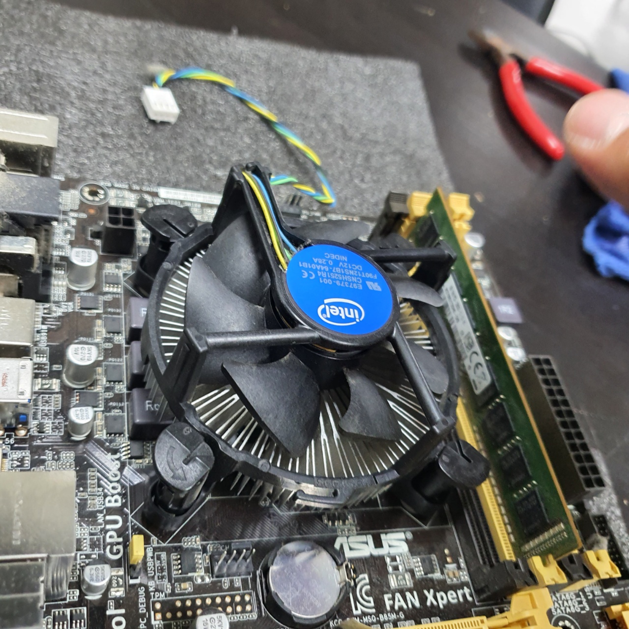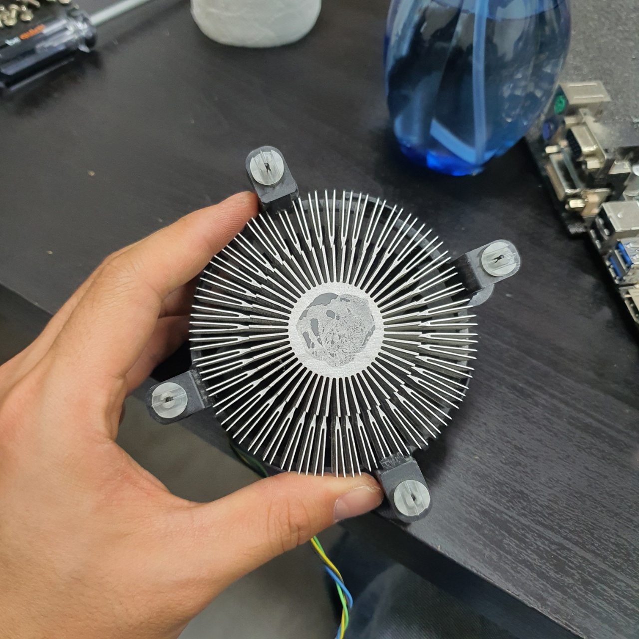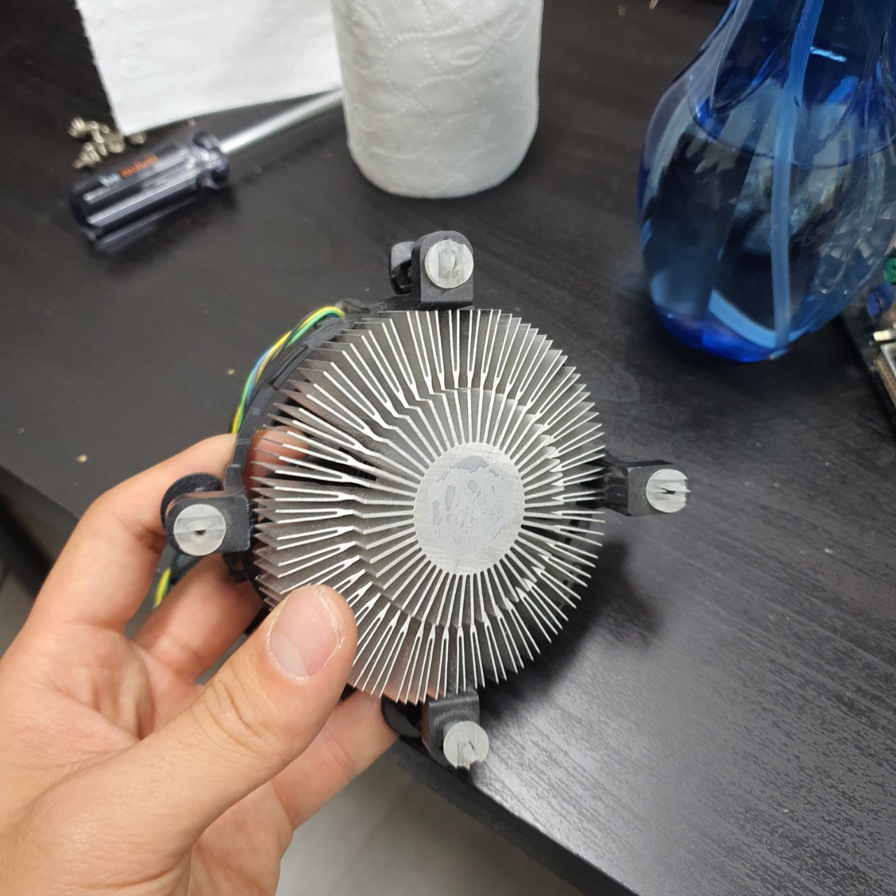 다시 연결해준 다음, CPU와 맞닿는 부분을 휴지로 한번더 닦아주면 된다.