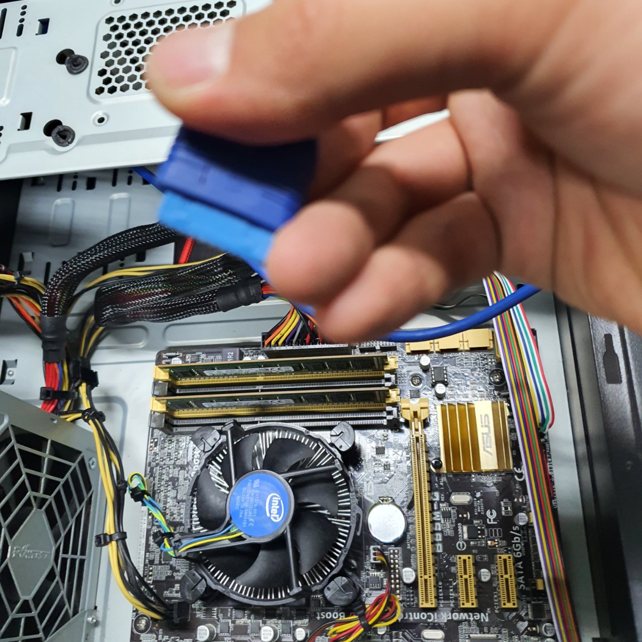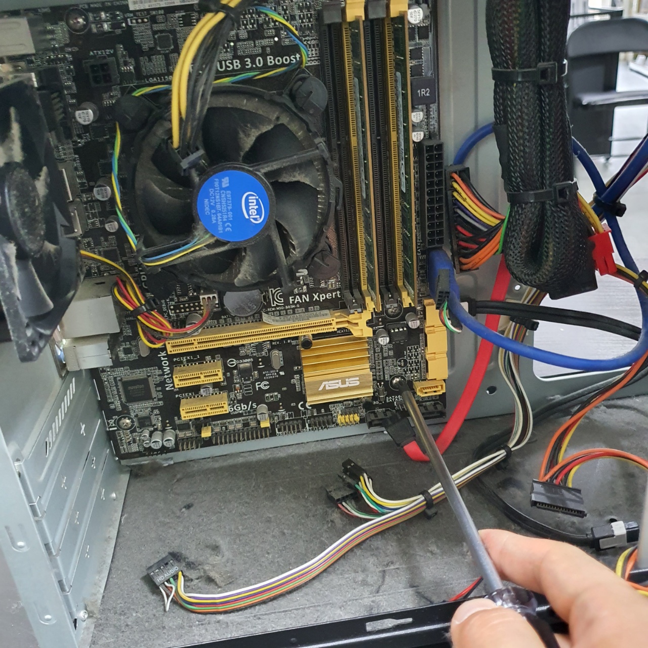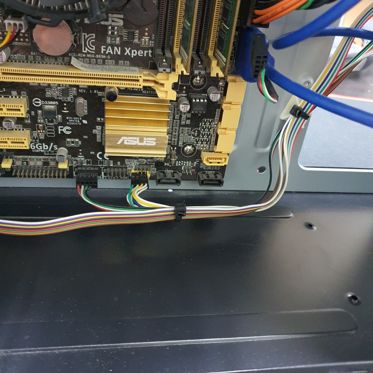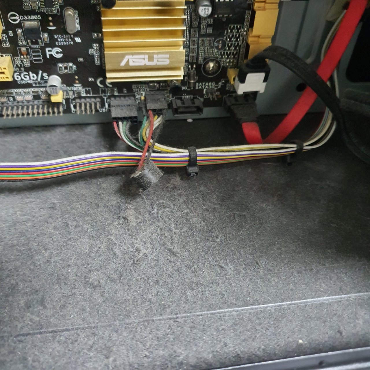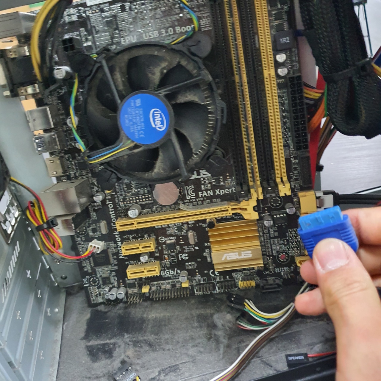 위의 포트는 케이스의 USB3.0 포트인데 메인보드와 분리를 하는도중 메인보드의 단자가 손상될 수 있으므로 케이블과 메인보드를 잘 잡은 뒤에 조심스레 흔들어 뽑아야 한다.