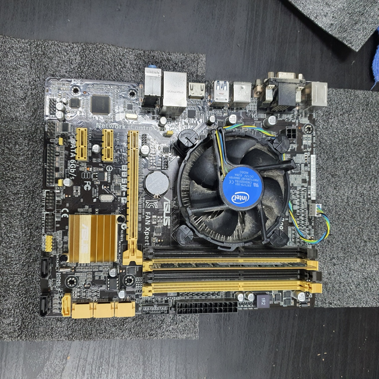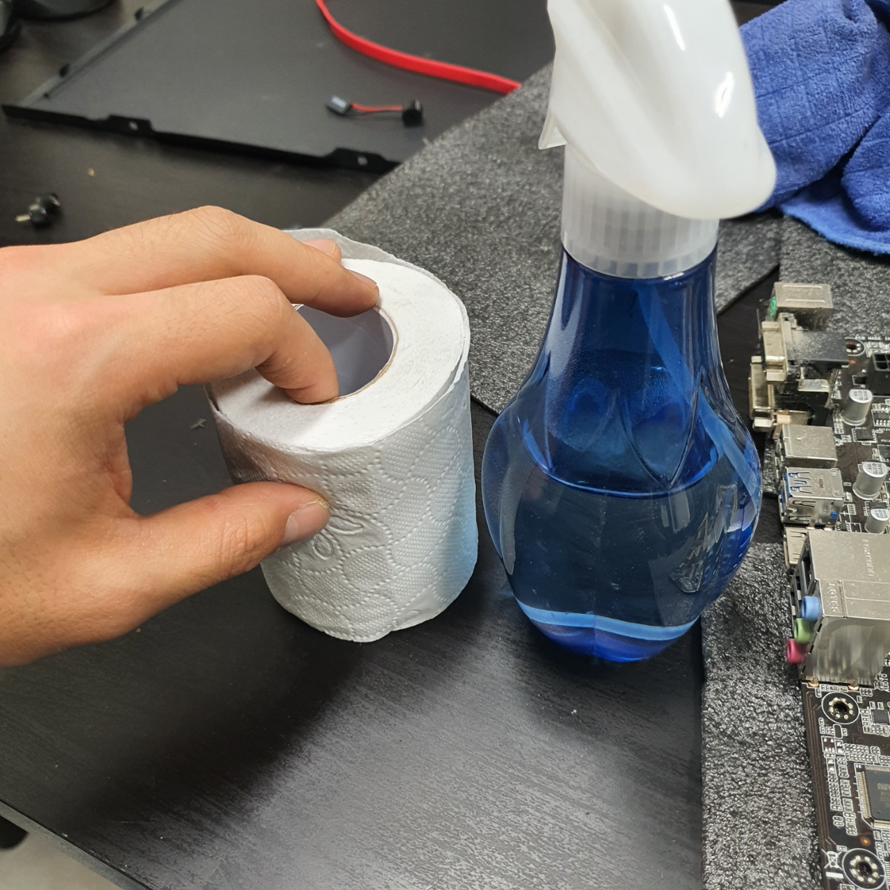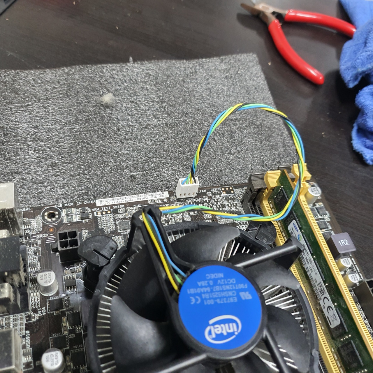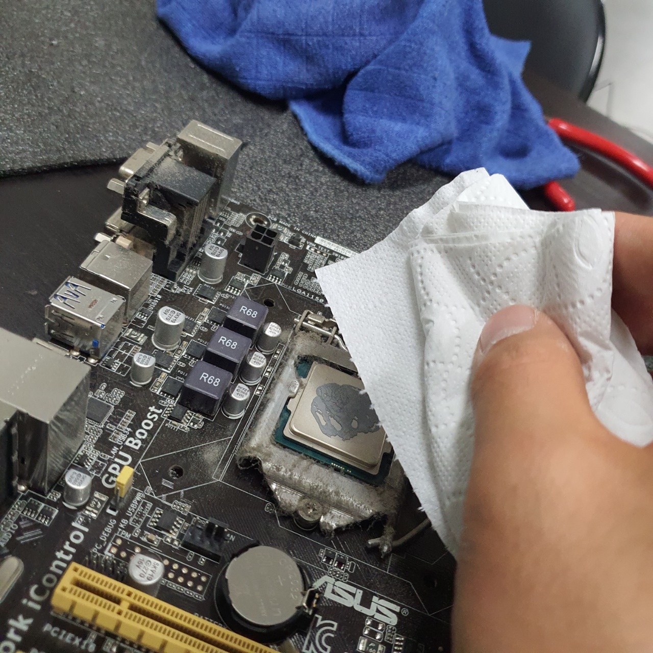 다음은 메인보드를 받쳐두기위해 부직포와같은 것을 바닥에 두고 위에 메인보드를 올려둔다.