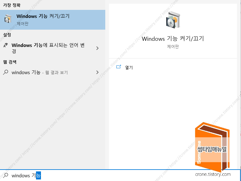 WebDAV서비스의 구축을 위해서는 IIS콘솔과, WWW(Wolrd wide Web) 의 기능을 활성화 하여야 한다, 해당 기능을 활성화 하기위해서는 시작 버튼을 눌러 "Windows 기능" 을 입력하여 설정 창을 띄우도록 한다.