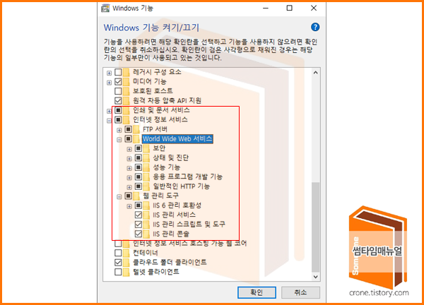 Windows 기능 켜기/끄기 화면에서 아래의 기능들을 활성화 하도록 한다.