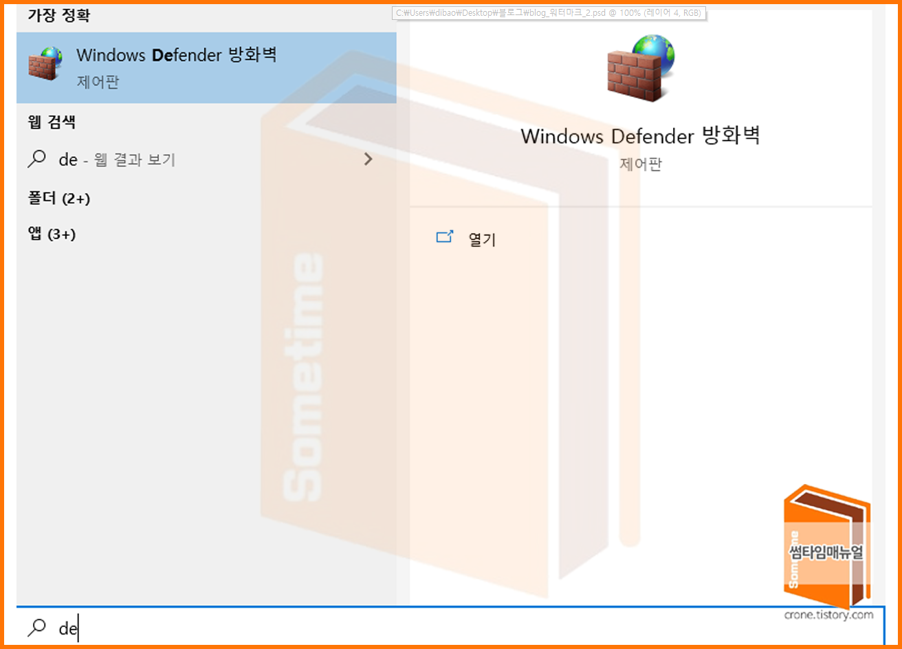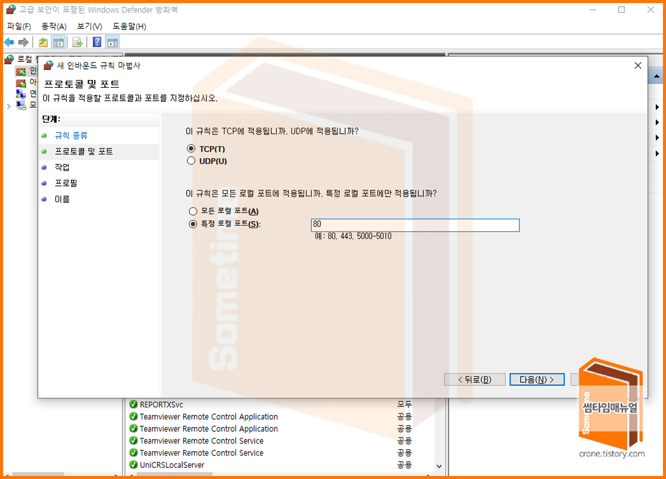 다음은 방화벽에서의 포트를 개방해주도록 하여야 하므로 Windows Defender 방화벽 설정 화면으로 이동한다.