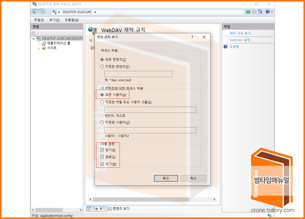 제작 규칙에는 "모든 사용자" 와, 사용권한은 읽기, 원본, 쓰기 권한을 부여하도록 한다.