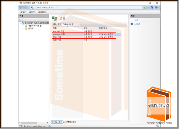 Windows 인증, 기본인증에 "사용" 으로 변경하도록 한다.