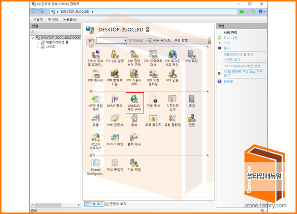윈도우 키를 눌러 IIS를 입력하면 인터넷 정보 서비스 관리자를 찾아볼 수 있으며 해당 화면을 선택하게 되면 WebDAV 을 관리할 수 있다.